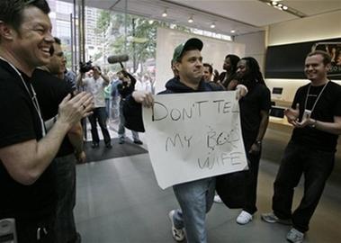 Một khách hàng nhiệt tình với iPhone đi vào trong tiếng cười và vỗ tay của nhân viên bán hàng. "Đừng nói với vợ tôi" là câu mà anh ta đã viết trên tờ giấy to. Phải chăng anh chàng này giấu vợ đi mua iPhone? Ảnh: AP |