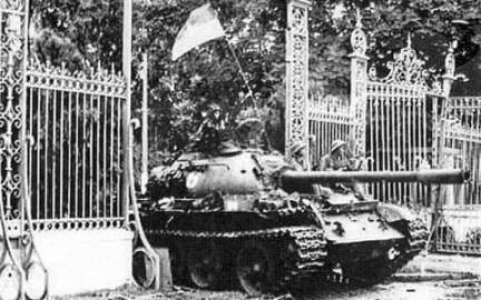 | Hình ảnh đi vào lịch sử- xe tăng 390 thuộc Lữ đoàn thiết giáp 203 húc đổ cánh cổng Dinh Độc Lập. |