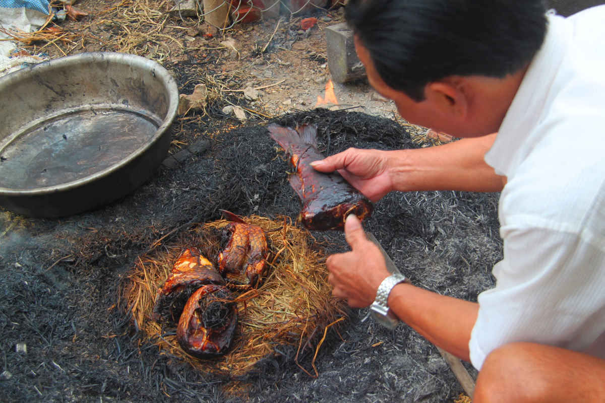 Thời gian đốt lửa kéo dài liên tục khoảng 30 phút. Sau đó người ta sẽ phủ một lớp trấu dày quanh mặt chậu rồi đốt thêm từ 4 – 5 tiếng. Thành phẩm cá nướng úp chậu chín đều, lớp da béo ngậy, giòn dai, óng vàng cùng phần thân cá chắc thịt, thơm ngon phưng phức. Khi ăn, cá được chấm nước mắm pha gừng, vừa cay, vừa bùi, thơm mùi rơm nếp.