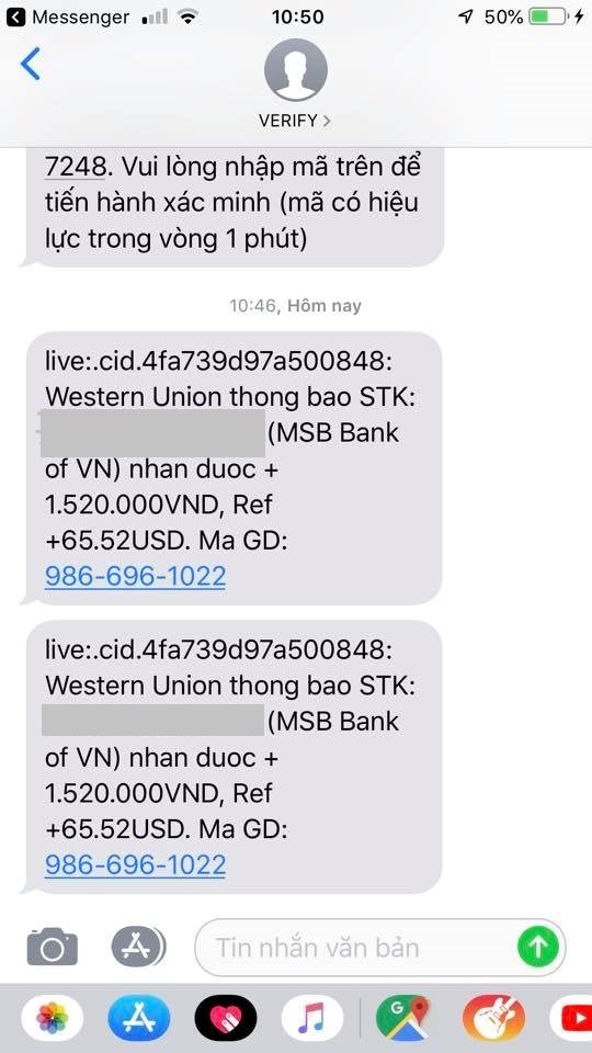 Sau đó, nick Nguyễn Thị Hồng nhắn tin qua Facebook bảo chị Q.P chờ tin nhắn báo về rồi chụp hình chờ cô ta hướng dẫn. Một lát sau điện thoại của chị Q.P có tiếp một SMS từ VERIFY báo số tài khoản ngân hàng của chị đã nhận được 1.520.000 VNĐ. Nhưng chị Q.P chưa thấy tài khoản của mình báo có tiền trong tài khoản.