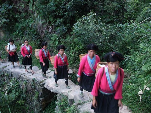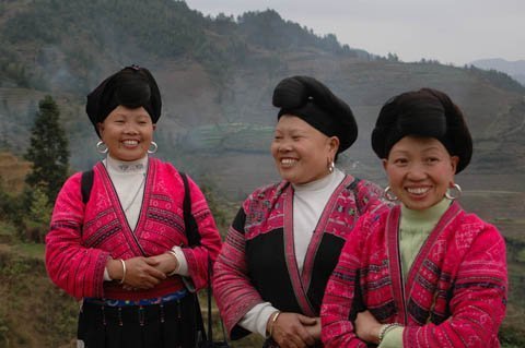 Tất cả những phụ nữ ở Huangluo đều bện mái tóc dài đen nhánh của mình giống như một cái mâm nhưng có một vài chi tiết có thể nói nhiều điều về họ. Nếu như mái tóc được cuốn đơn giản vòng quanh đầu, điều đó có nghĩa là cô ấy có chồng nhưng chưa có con. Nếu có ấy có một búi tóc nhỏ trước mặt, chứng tỏ cô ấy đã kết hôn và có con, còn nếu cô ấy quấn một chiếc khăn vuông quanh đầu, có nghĩa là cô ấy đang tìm kiếm bạn đời.