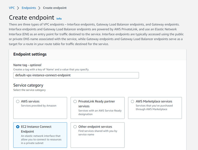 Tiếp theo, ở trang Create endpoint, cần điền tên cho endpoint ở phần Name tag, chọn EC2 Instance Connect Endpoint.