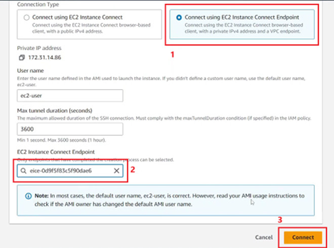Sau đó, chọn Connect using EC2 Instance Connect Endpoint, ở mục EC2 Instance Connect Endpoint chọn endpoint vừa tạo, rồi chọn Connect.