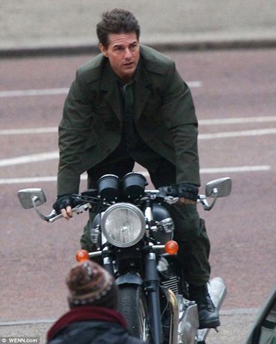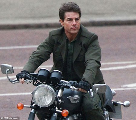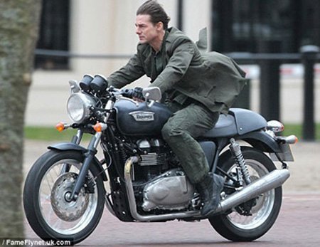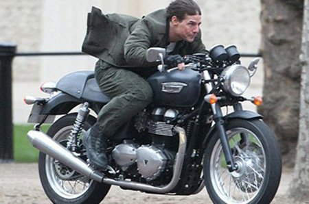Trong bộ phim mới có tên "All You Need Is Kill", nam tài tử Tom Cruise đã lái một chiếc Triumph Thruxton và không hề đội mũ bảo hiểm.