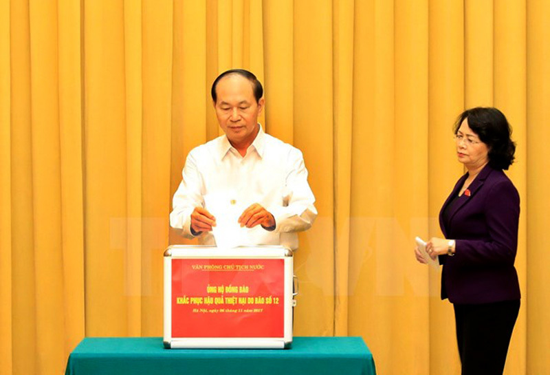 | Chủ tịch nước Trần Đại Quang và Phó Chủ tịch nước Đặng Thị Ngọc Thịnh tham gia quyên góp ủng hộ đồng bào các tỉnh Nam Trung Bộ bị ảnh hưởng nặng nề do cơn bão số 12 gây ra |