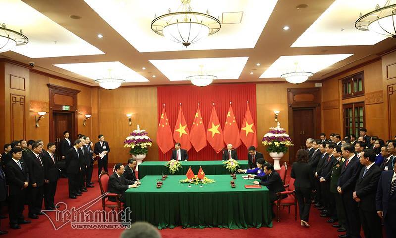 Sau cuộc hội đàm, Tổng bí thư Nguyễn Phú Trọng và Tổng bí thư, Chủ tịch Trung Quốc Tập Cận Bình đã chứng kiến lễ ký các văn kiện hợp tác giữa hai bên.