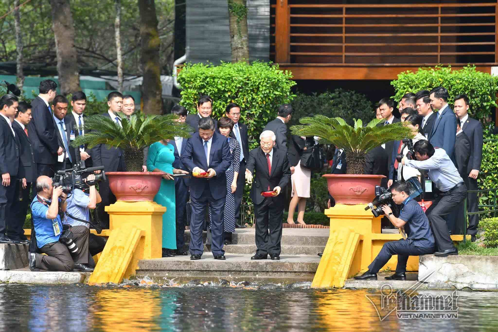 Hai nhà lãnh đạo cho cá ăn tại ao cá trước nhà sàn Chủ tịch Hồ Chí Minh.