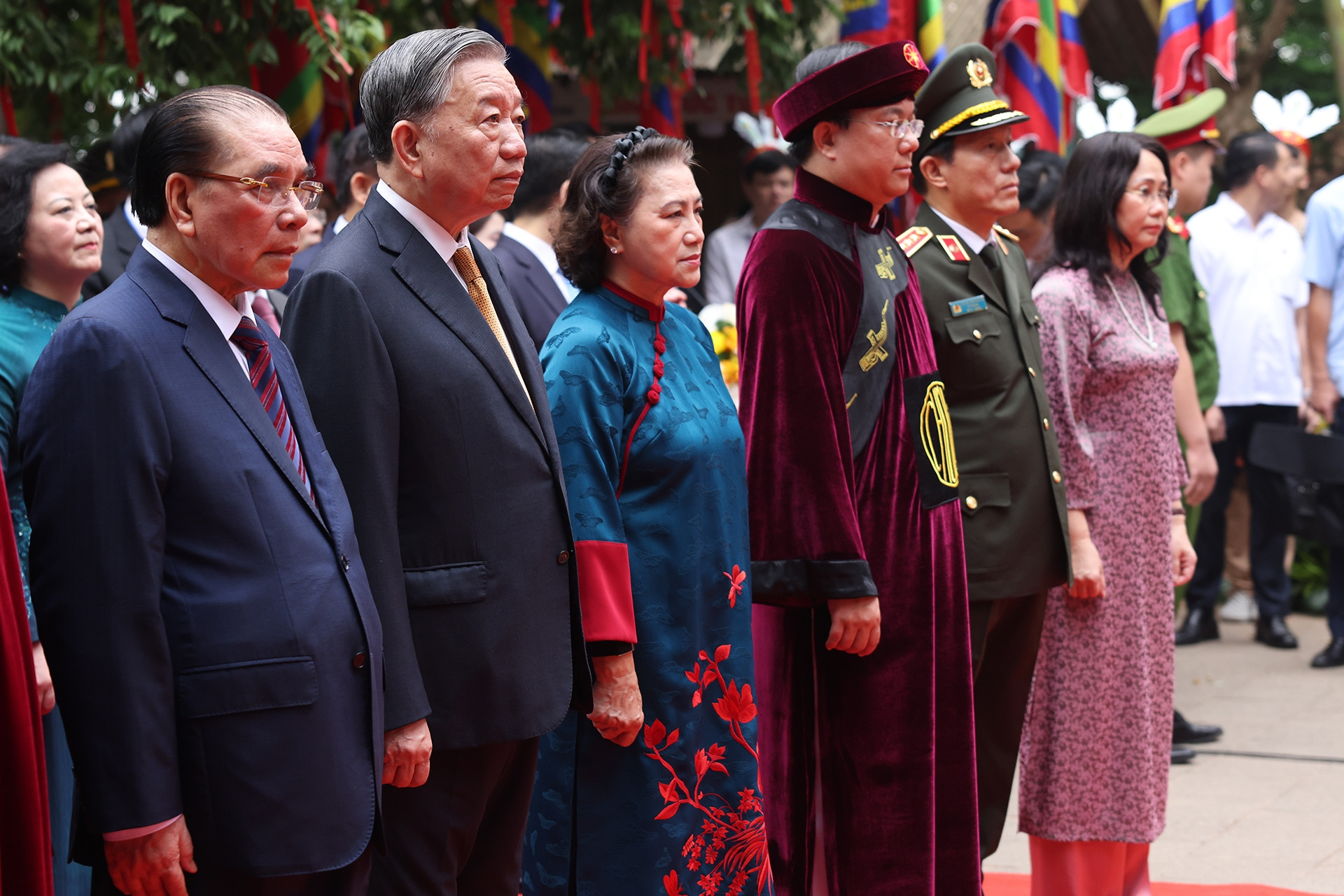 Trước anh linh các Vua Hùng, Tổng Bí thư, Chủ tịch nước Tô Lâm bày tỏ lòng thành kính tưởng nhớ công đức tổ tiên, tưởng nhớ Chủ tịch Hồ Chí Minh kính yêu và các thế hệ cha anh đã hy sinh vì độc lập, tự do, thống nhất của Tổ quốc và hạnh phúc của nhân dân.