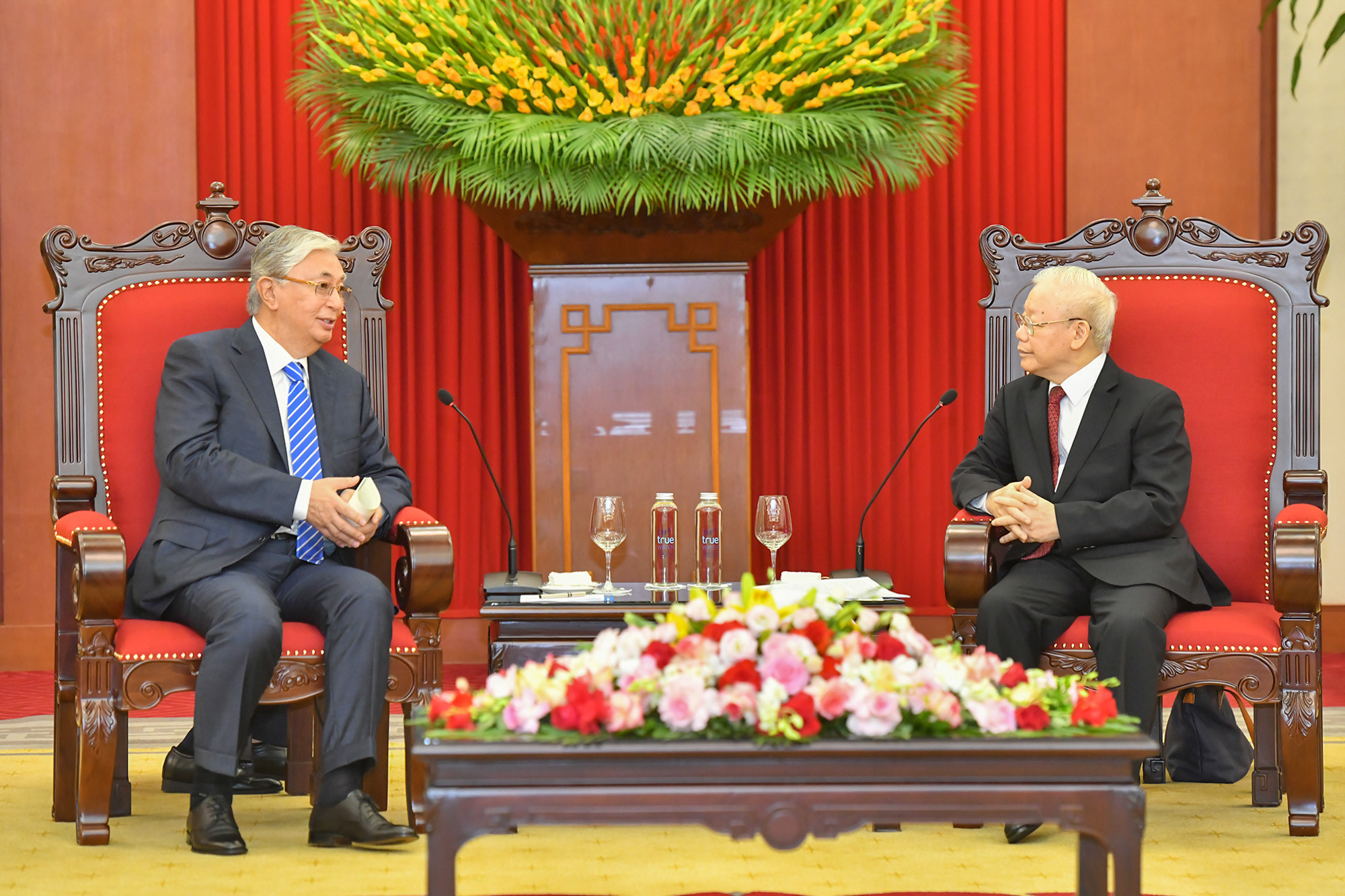 Tổng thống Kazakhstan thông báo với Tổng Bí thư Nguyễn Phú Trọng một số nét về tình hình, những cải cách sâu rộng các lĩnh vực Kazakhstan đang tiến hành nhằm phát triển kinh tế xã hội, bảo đảm ổn định và phát triển.