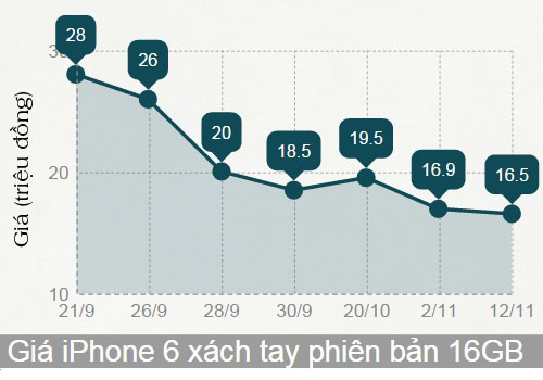 Tại thời điểm hiện nay, giá của iPhone 6 phiên bản xách tay 16 GB được xác định là rơi vào khoảng 16,2 cho tới 16,7 triệu đồng, còn iPhone 6 Plus thì vững giá ở xấp xỉ 20 triệu đồng.