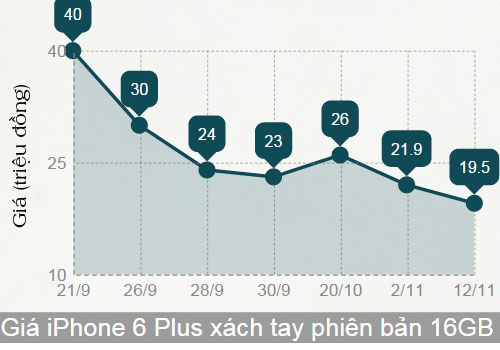 Điều đáng nói là mức giá này nhanh chóng giảm xuống quá nửa chỉ sau một tuần ra mắt. Cụ thể là vào ngày 26/9, khi mức giá của iPhone 6 Plus quốc tế tụt xuống còn xấp xỉ 27 triệu đồng, thì các cửa hàng điện thoại tại Việt Nam đồng loạt rao bán với giá 30 triệu đồng.