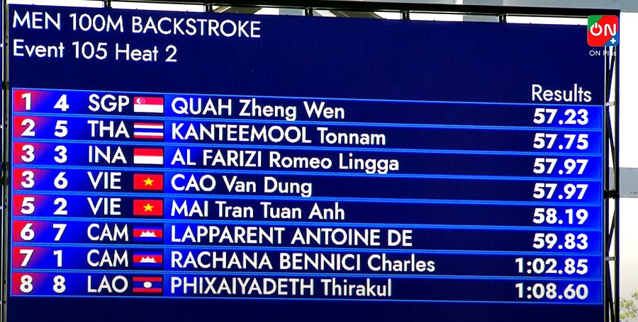 Ở chung kết 100m ngửa nam, hai kình ngư của Việt Nam là Cao Văn Dũng (57 giây 20) và Mai Trần Tuấn Anh (57 giây 64) chỉ về đích lần lượt thứ 6 và 7. HCV thuộc về kình ngư của Singapore, Quah Zheng Wen với thời gian 55 giây 22.