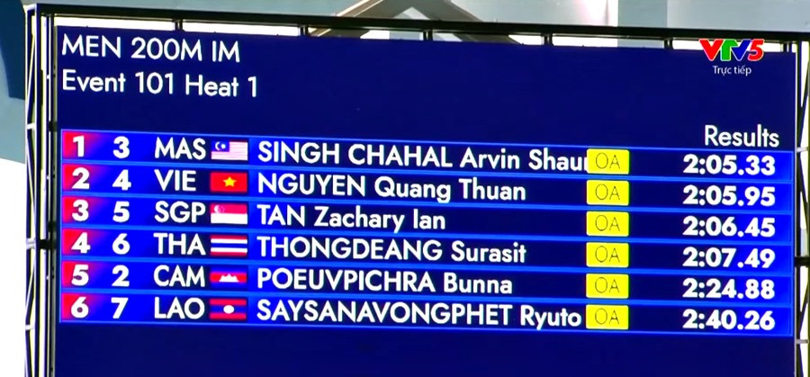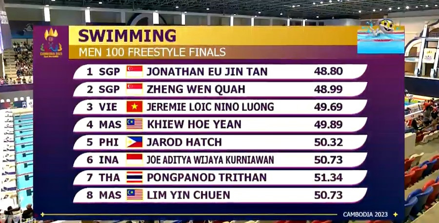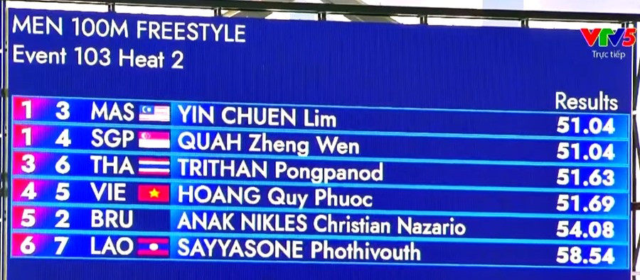 VĐV Việt kiều Pháp Jeremie Lương về đích thứ 2 ở lượt bơi thứ nhất vòng loại 100m tự do nam. Hoàng Quý Phước về đích thứ 4 ở lượt thứ 2.