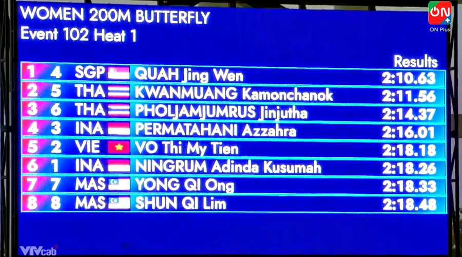 Võ Thị Mỹ Tiên chỉ về đích thứ 5 với thành tích 2 phút 18 giây 18 ở chung kết nội dung 200m bướm dành cho nữ.