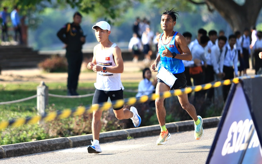 Phải thi đấu trong điều kiện nắng nóng tại Campuchia khiến các VĐV tốn rất nhiều sức. Hoàng Nguyên Thanh đang trong top 4, Trịnh Quốc Lượng chạy ngay phía sau người đồng đội.
