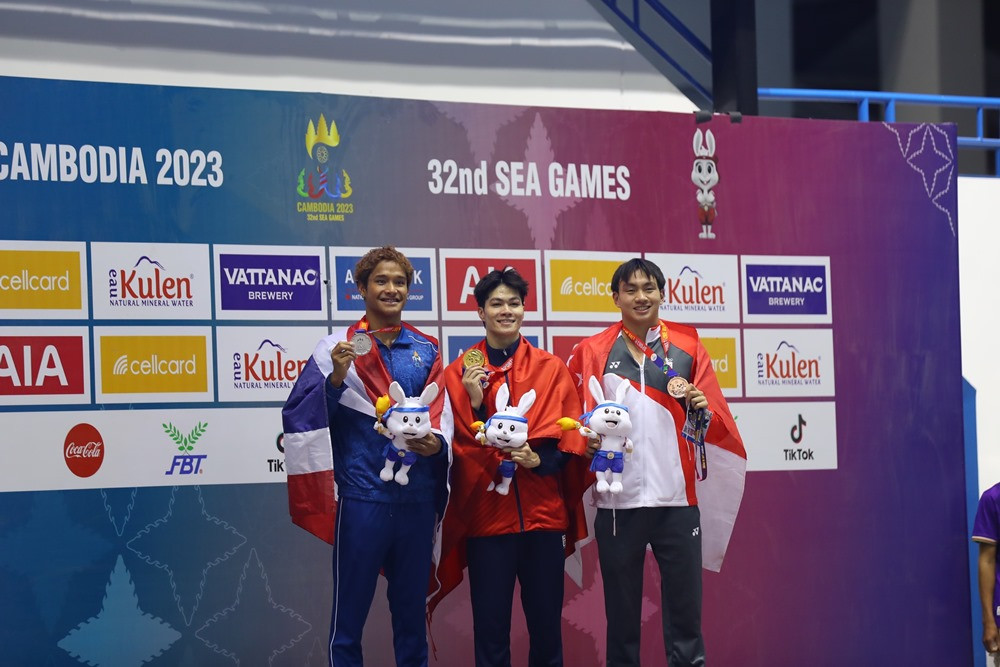 VĐV Việt kiều Pháp Jeremie Lương về đích thứ 3 với thành tích 49 giây 69, sau hai kình ngư của Singapore để giành HCĐ nội dung 100m tự do nam.
