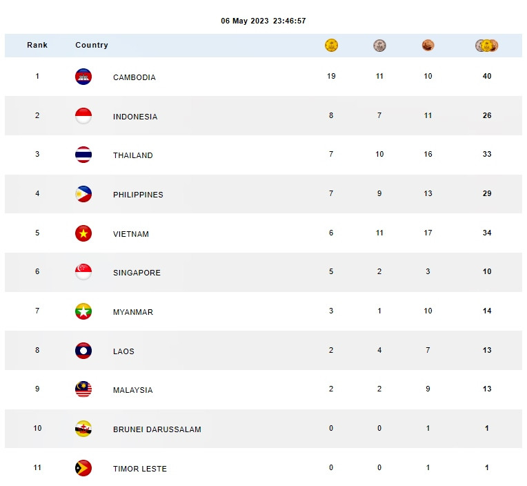 Đoàn chủ nhà Campuchia với 19 HCV, 11 HCB và 11 HCĐ đang dẫn đầu trên bảng tổng sắp huy chương và tạo ra khoảng cách khá lớn với các đoàn còn lại.