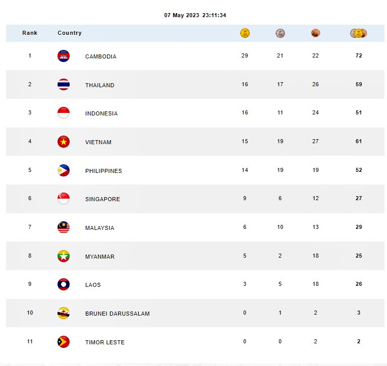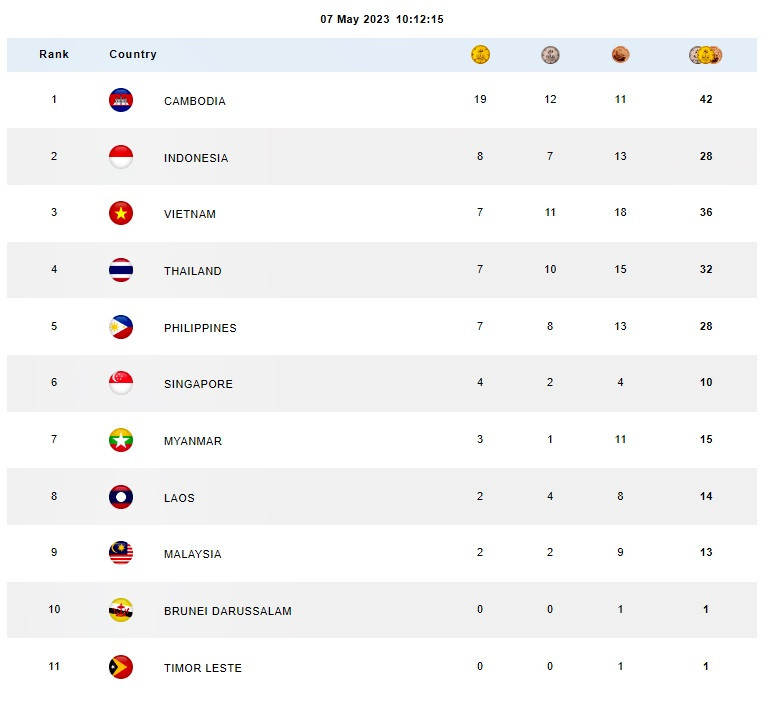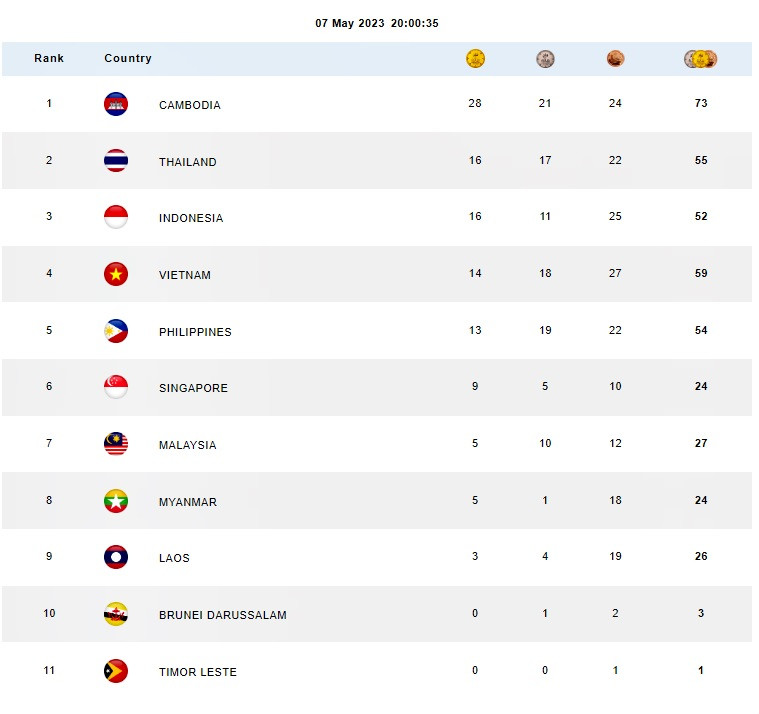 Đoàn chủ nhà Campuchia với 19 HCV, 11 HCB và 11 HCĐ đang dẫn đầu trên bảng tổng sắp huy chương và tạo ra khoảng cách khá lớn với các đoàn còn lại.