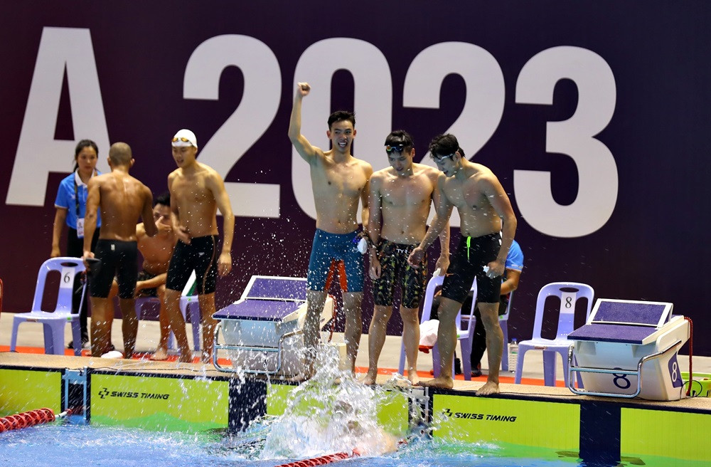 Ở chung kết bơi tiếp sức 4x200m tự do nam, nội bơi tiếp sức của Việt Nam gồm Nguyễn Hữu Kim Sơn, Nguyễn Huy Hoàng, Hoàng Quý Phước và Trần Hưng Nguyên đã xuất sắc về đích đầu tiên để bảo vệ thành công tấm HCV ở nội dung này.