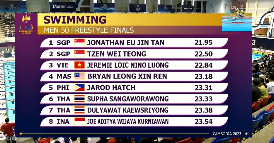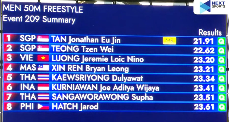 Kình ngư Việt kiều Pháp Jeremie Loic Nino Lương cán đích thứ 3 với thành tích 22 giay 84 để giành HCĐ nội dung 50m tự do nam. HCV và HCB đề thuộc về các VĐV của Sinapore.