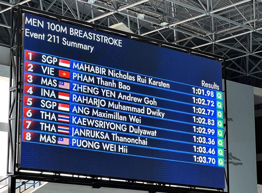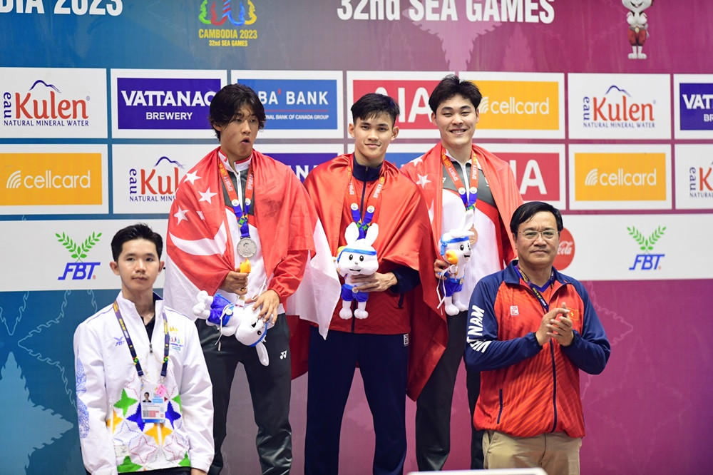 Thành tích của kình ngư quê Bến Tre là 1 phút 00 giây 97. HCB và HCĐ đều thuộc về 2 VĐV của Singapore.