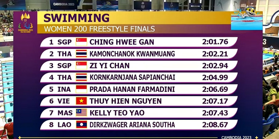 VĐV Nguyễn Thúy Hiền về đích thứ 6 với thời gian 2 phút 07 giây 17 ở chung kết 200m tự do nữ. Thành tích này rất đáng khích lệ dành cho kình ngư mới 14 tuổi của Việt Nam.