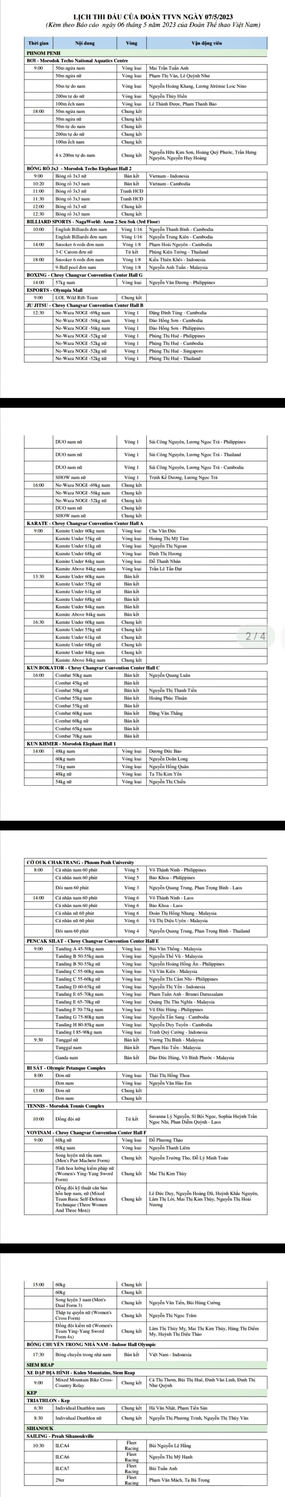 Lịch thi đấu của đoàn TTVN hôm nay 7/5