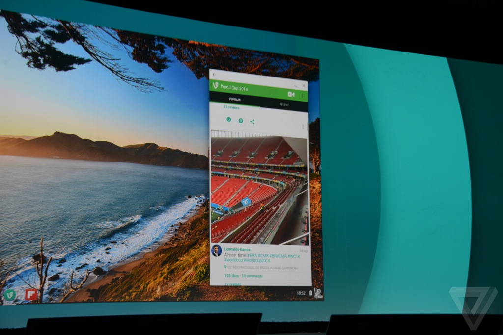 Google đang nỗ lực để đưa Chrome OS và Android đến gần nhau hơn, đồng nghĩa với việc ứng dụng Android từ nay có thể chạy trên Chromebook. Ông Sundar Pichai cho biết, Google mới đang ở giai đoạn đầu tiên và không tiết lộ khi nào tính năng này xuất hiện song đã trình diễn ứng dụng Evernote, Flipboard, Vine trên laptop. Các dịch vụ này hiển thị trên một cửa sổ có chiều cao tương ứng với chiếc điện thoại hoặc mở rộng ra như chạy trên tablet.