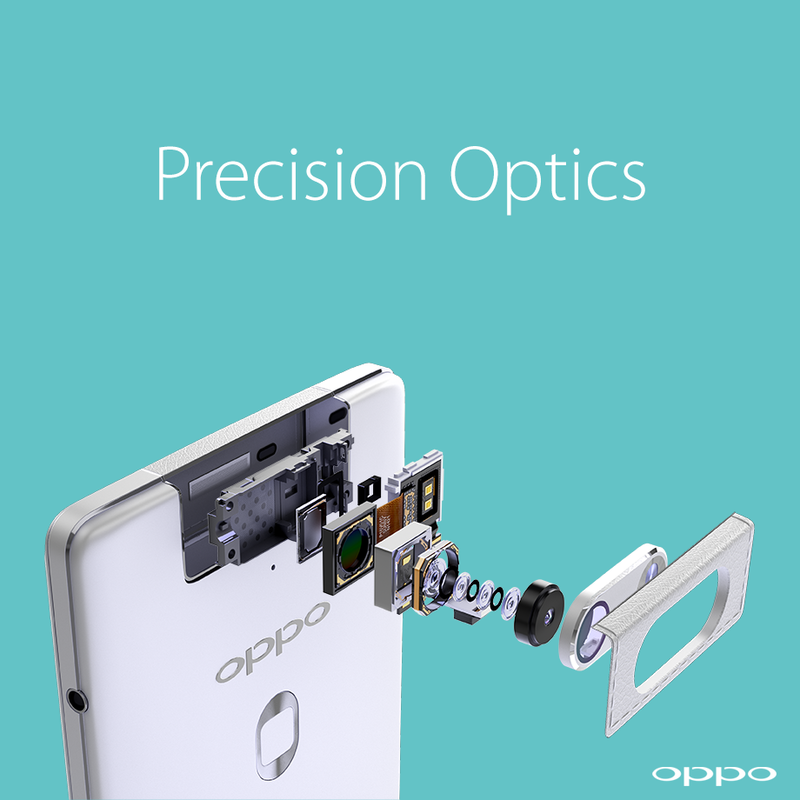Trên Facebook chính thức, OPPO đăng ảnh chi tiết về mặt sau của máy. Bên dưới cụm camera là vùng cảm biến nhỏ, được cho là vùng cảm biến vân tay để mở khóa màn hình tương tự Touch ID trên iPhone 5s, iPhone 6 và 6 Plus.