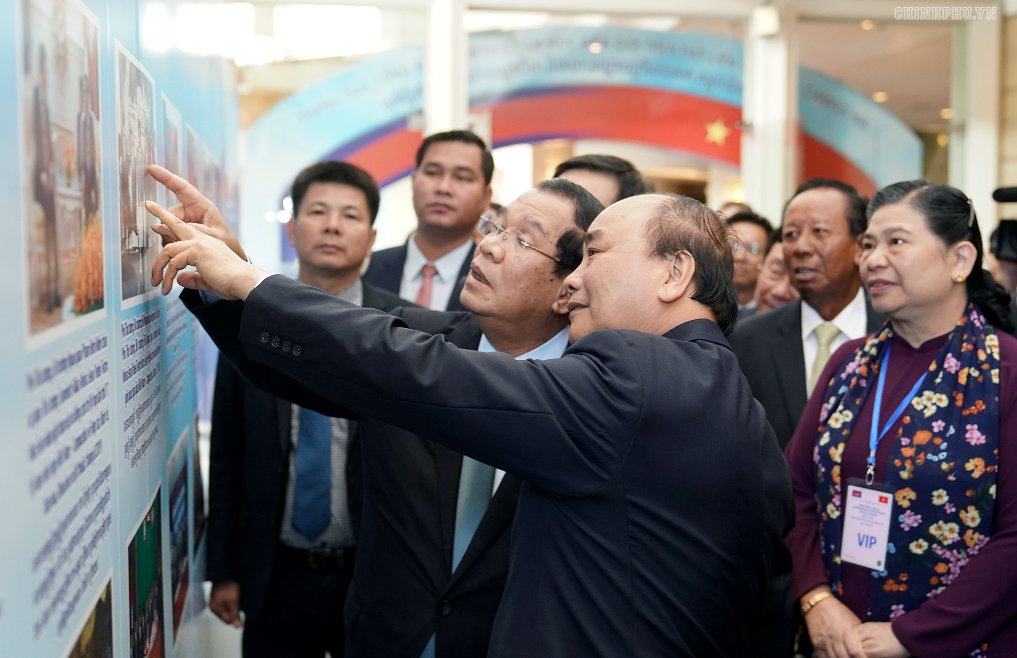 Thủ tướng Nguyễn Xuân Phúc và Thủ tướng Campuchia Samdech Hun Sen xem một số hình ảnh trưng bày tại hội nghị. Ảnh VGP/Quang Hiếu |