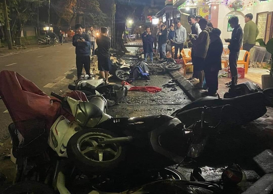 Vụ va chạm làm 8 xe máy ngã đổ ra đường và bị hư hỏng nặng. Nhiều người dân ở gần hiện trường hoảng loạn.