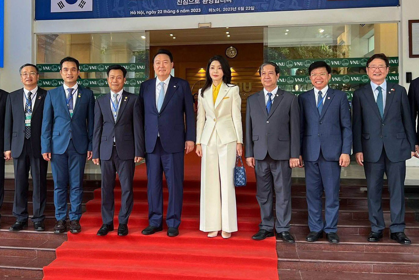 Tiếp đó, Tổng thống Hàn Quốc Yoon Suk-yeol cùng phu nhân đã tới thăm và giao lưu với các sinh viên Đại học Quốc gia Hà Nội.