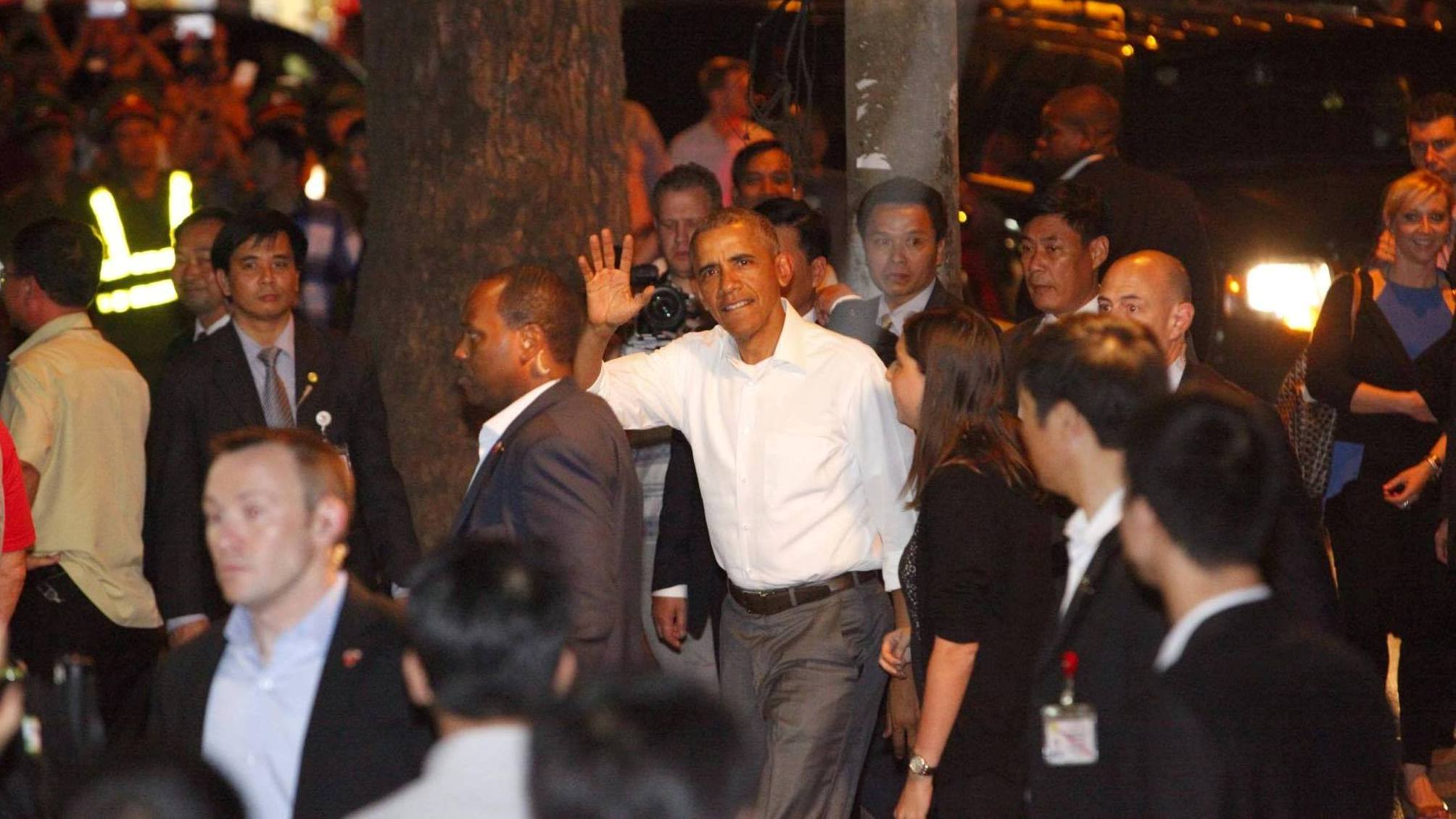Tổng thống Obama nhanh chóng bước từ xe Cadillac One xuống quán bún chả. Tổng thống Mỹ vẫy tay thân thiện với người dân.