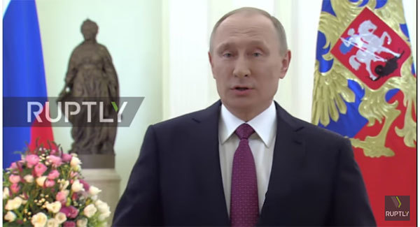 Tổng thổng Nga nói tiếp: "Chúng tôi luôn hướng về phụ nữ để tìm nguồn cảm hứng và niềm an ủi, và luôn luôn tìm thấy nó. Phụ nữ cho chúng ta cuộc sống và kéo dài nó mãi mãi bằng thế hệ tương lai.