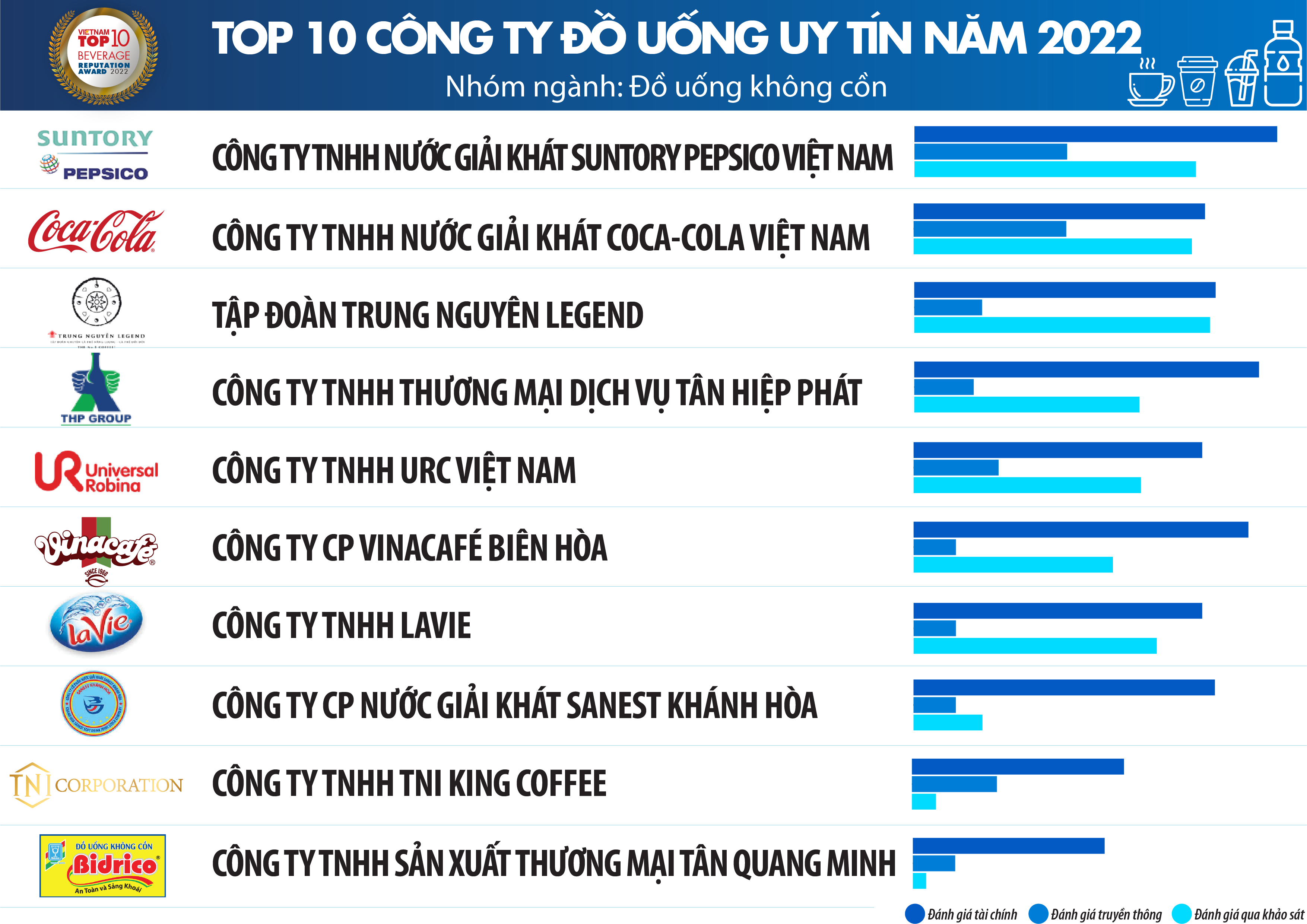 Top 10 Công ty uy tín ngành Thực phẩm - Đồ uống năm 2022 được xây dựng dựa trên các nguyên tắc khoa học và khách quan. Các công ty được đánh giá, xếp hạng dựa trên 3 tiêu chí chính: (1) Năng lực tài chính thể hiện trên báo cáo tài chính năm gần nhất (2) Uy tín truyền thông được đánh giá bằng phương pháp Media Coding - mã hóa các bài viết về công ty trên các kênh truyền thông có ảnh hưởng; (3) Khảo sát đối tượng nghiên cứu và các bên liên quan: người tiêu dùng, chuyên gia… được thực hiện trong tháng 8/2022.