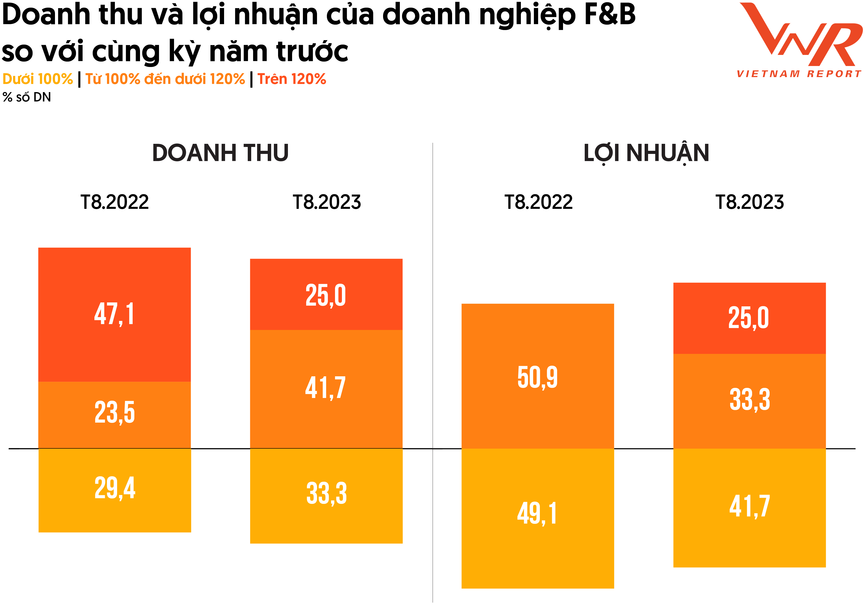 Theo khảo sát của Vietnam Report với các doanh nghiệp trong ngành, do nguy cơ suy thoái kinh tế ảnh hưởng tới sức mua của người tiêu dùng, tỷ lệ doanh nghiệp F&B ghi nhận tăng doanh thu cũng giảm theo.