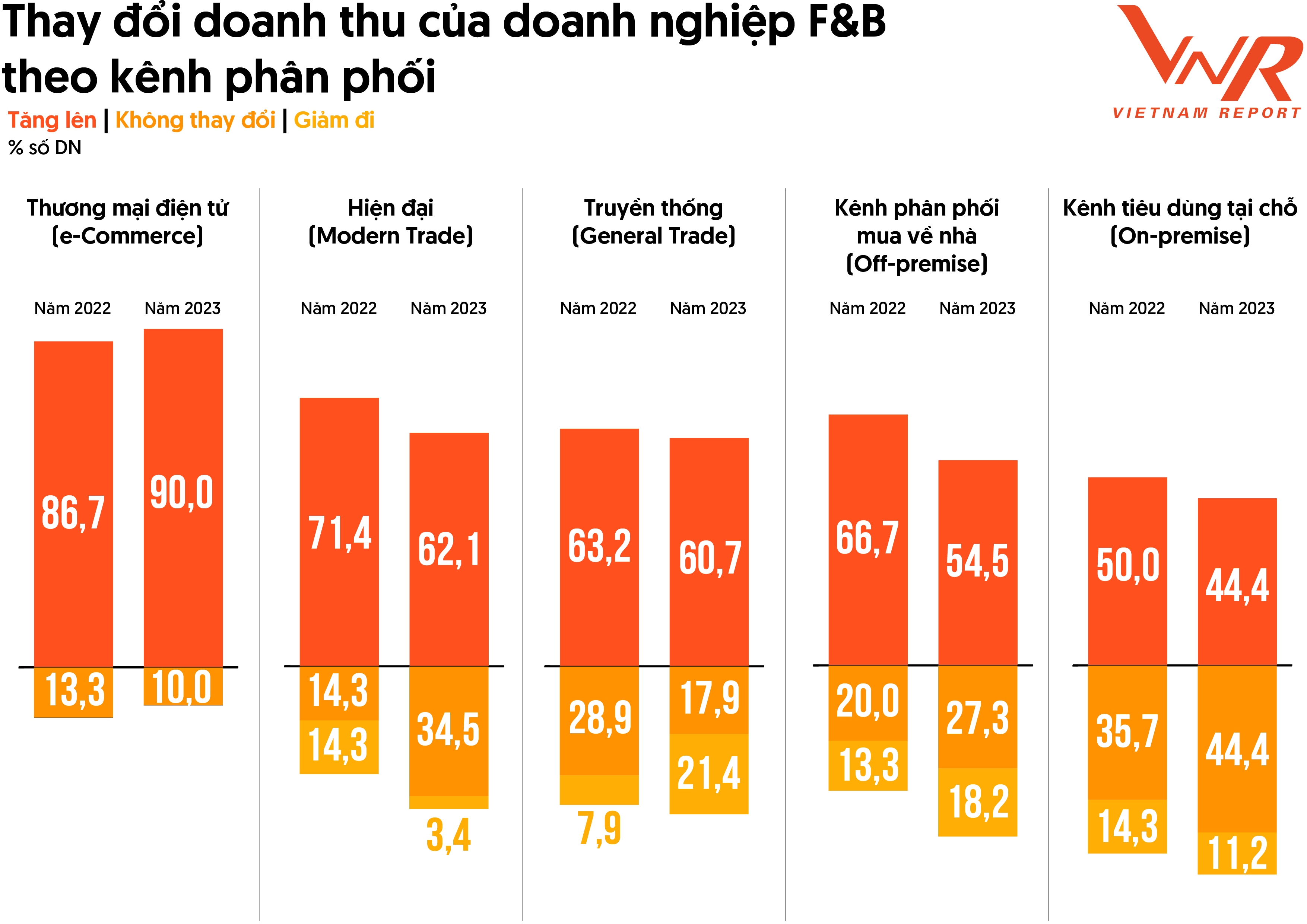 Bước sang năm 2023, tỷ lệ doanh nghiệp F&B giữ được nhịp tăng trưởng về doanh thu đều giảm ở hầu hết các kênh phân phối. Trong đó, sự giảm tốc thể hiện rõ ở các kênh truyền thống (General Trade) và kênh phân phối mua về nhà (Off-premise) với tỷ lệ lần lượt là 21,4% và 18,2%. Kênh thương mại điện tử (e-Commerce) vẫn thể hiện sự tăng trưởng tương đối ổn định so với mặt bằng chung, là kênh duy nhất không ghi nhận tỷ lệ sụt giảm doanh thu.