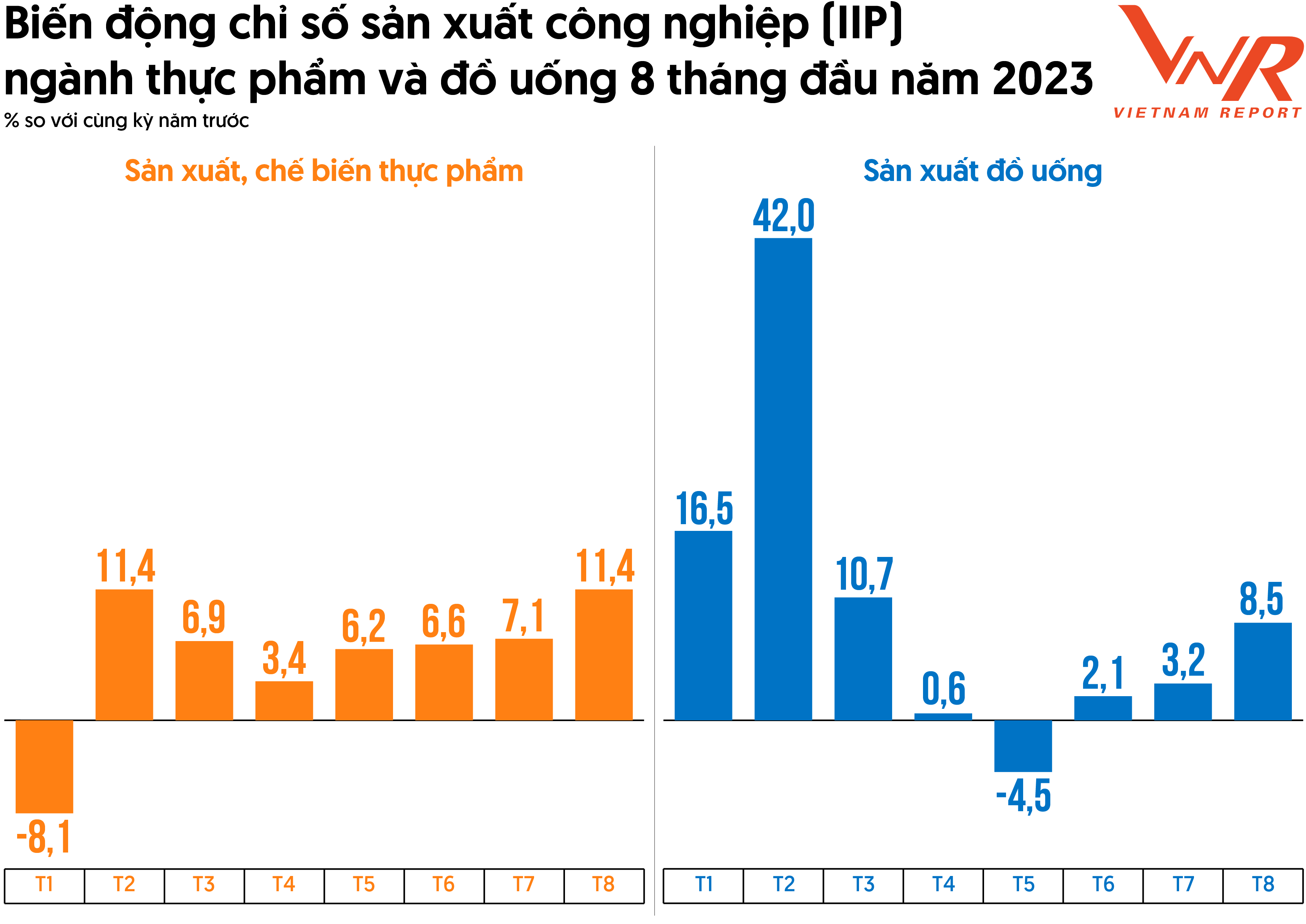 Những khó khăn của ngành F&B còn được thể hiện qua diễn biến chỉ số sản xuất công nghiệp (IIP) của hai ngành sản xuất, chế biến thực phẩm và sản xuất đồ uống khi sụt giảm liên tiếp từ cuối quý I đến giữa quý II/2023.