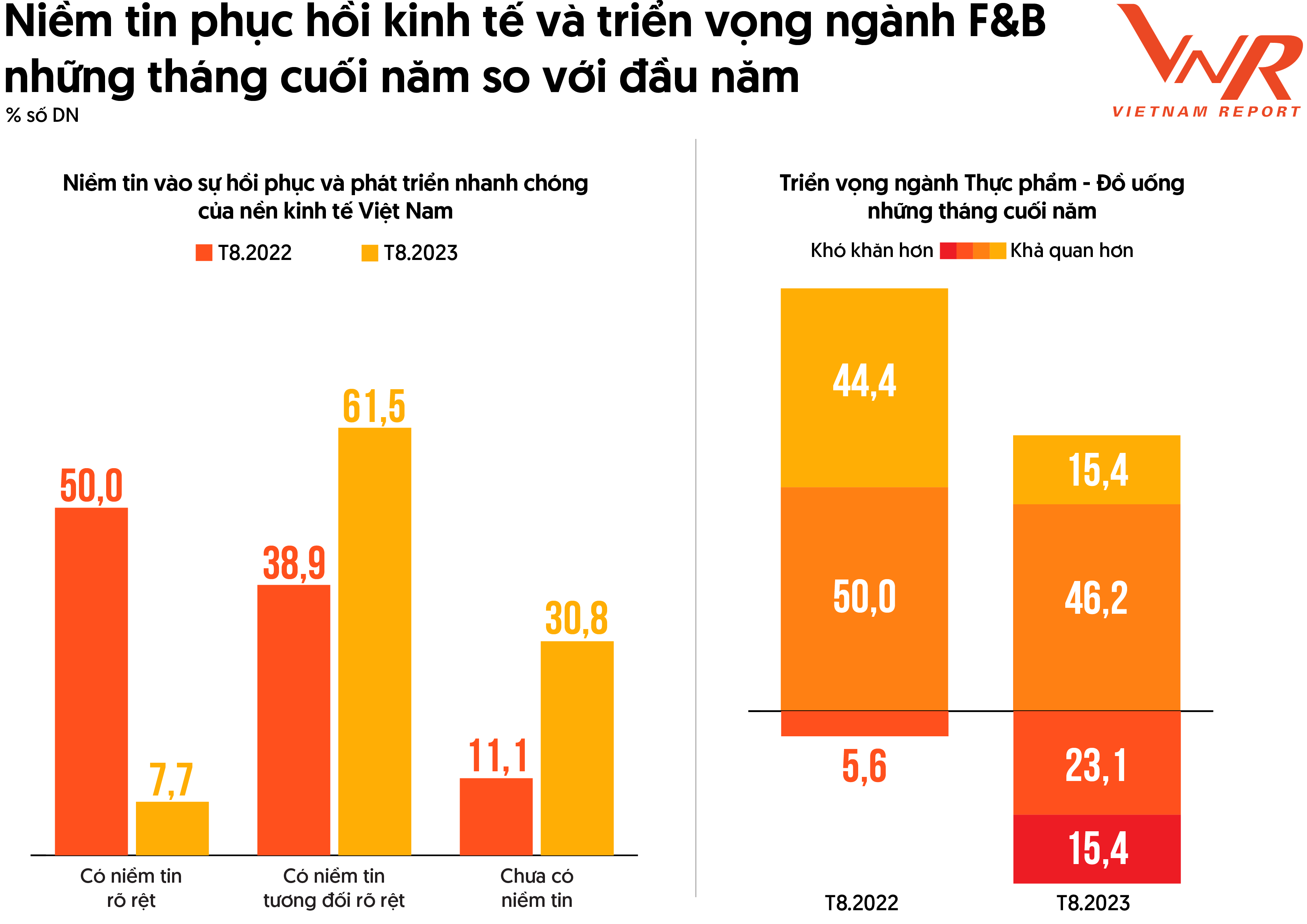 Nhận định về sự phục hồi và phát triển của nền kinh tế Việt Nam trong năm 2023, tuy niềm tin vào sự phục hồi mạnh mẽ giảm rõ rệt nhưng 61,5% doanh nghiệp vẫn kỳ vọng về khả năng phục hồi của nền kinh tế cuối năm. Phần lớn doanh nghiệp cho rằng thị trường F&B sẽ lạc quan hơn, song tỷ lệ này giảm rất nhiều so với năm trước (từ 94,4% xuống 61,6%).