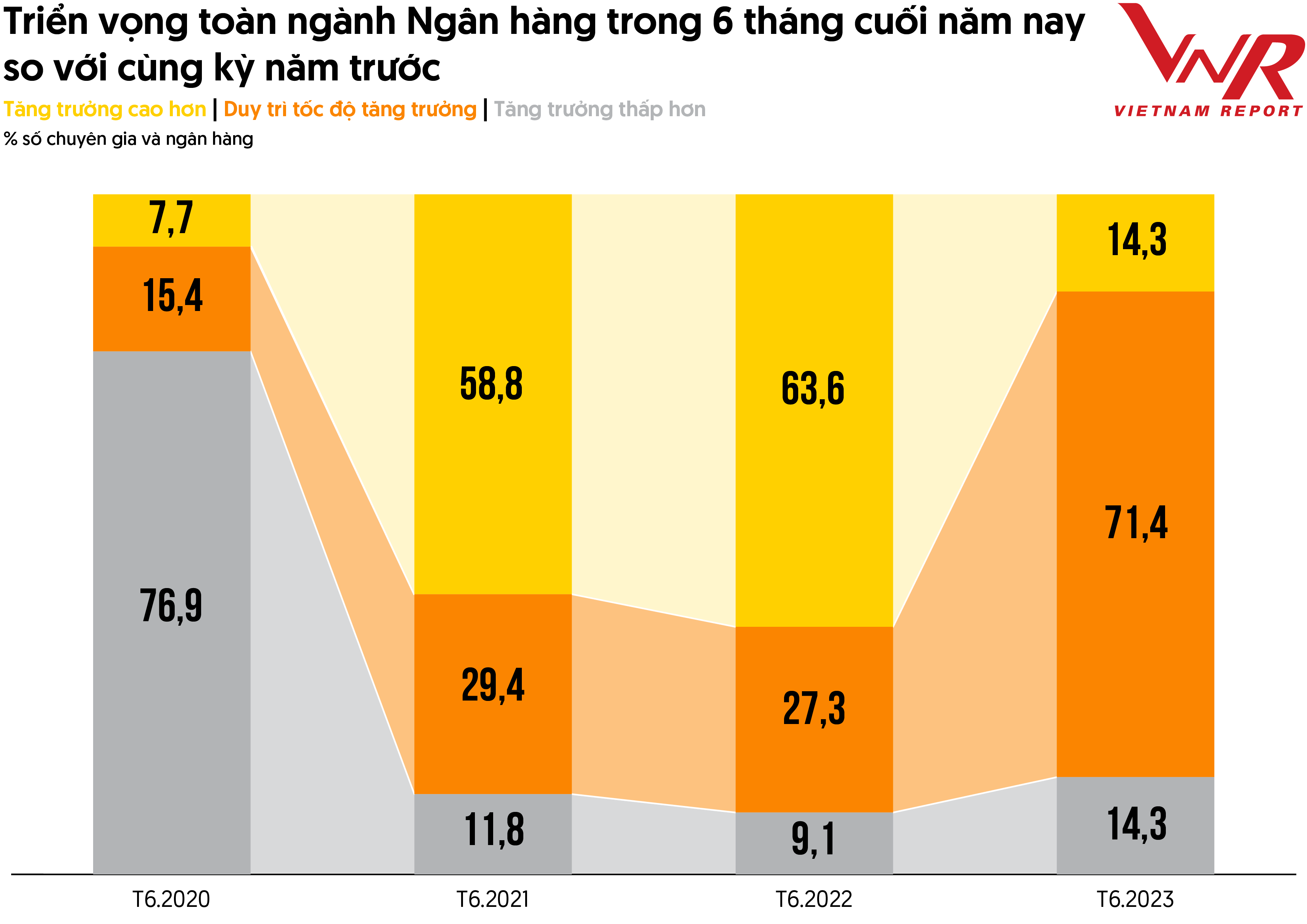 Theo khảo sát mới đây của Vietnam Report, các ngân hàng không kỳ vọng vào tăng trưởng đột phá trong nửa cuối năm 2023. Dự báo triển vọng toàn ngành sẽ ở trạng thái ổn định, duy trì tốc độ tăng trưởng (+44,2% và +42,0% so với kết quả khảo sát năm 2022 và 2021).