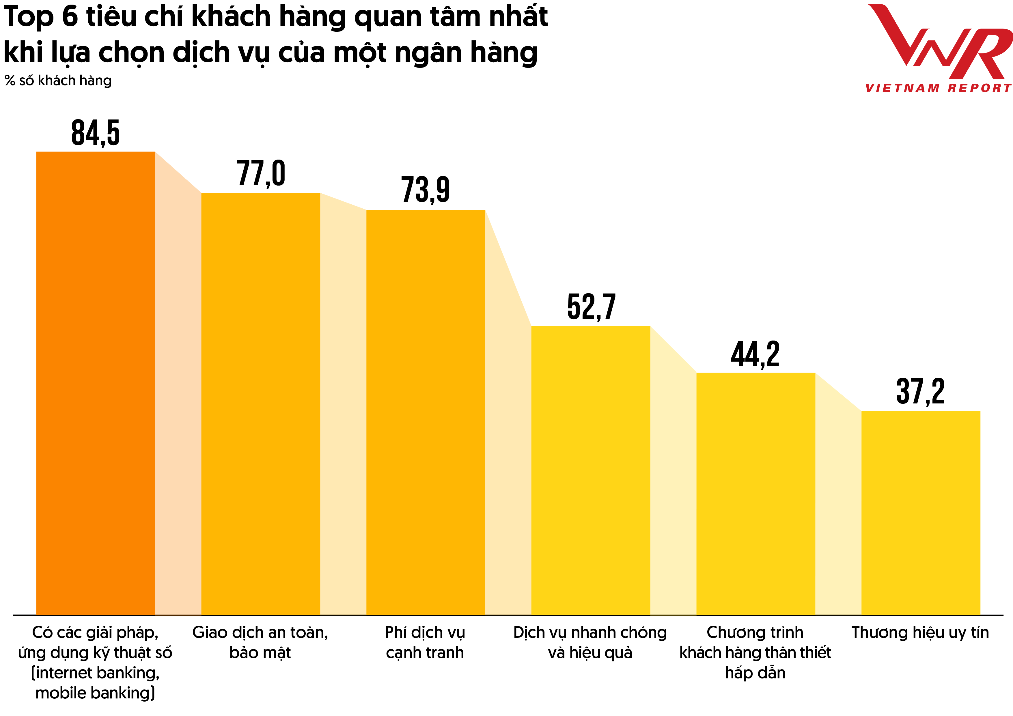Không ngừng đẩy mạnh công tác chuyển đổi số là xu thế tất yếu khi người dùng ngày càng chú trọng tới các giải pháp số. Khảo sát khách hàng được Vietnam Report tiến hành mới đây chỉ ra việc ngân hàng có các giải pháp/ ứng dụng kỹ thuật số hấp dẫn, tiện lợi được khách hàng quan tâm nhiều nhất khi lựa chọn dịch vụ ngân hàng (84,5%); tiếp đến là giao dịch an toàn, bảo mật (77,0%).