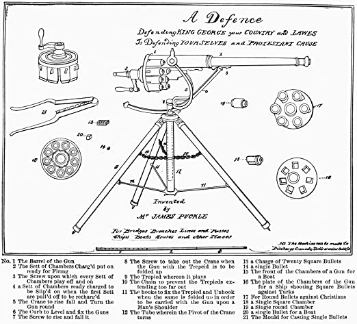 Súng Puckle thường được xem là khẩu "súng máy" đầu tiên trên thế giới có giá đỡ ba chân, sử dụng ổ xoay và khóa nòng. Khẩu súng này được thiết kế để gắn lên boong tàu chiến và có thể bắn 63 phát trong 7 phút. Nhìn sơ qua thì anh em sẽ nghĩ khẩu Puckle này cũng giống như các loại súng thời xưa thôi đúng không. Thật ra, điểm đặc biệt của khẩu này là có thể bắn hai loại đạn, một là loại đạn bi tròn, hai là loại có hình lập phương. Loại đạn bi tròn dùng để bắn người theo đạo Thiên Chúa giáo, còn đạn hình lập phương sẽ bắn người Thổ Nhĩ Kỳ theo đạo Hồi. Ngày xưa phân biệt chủng tộc, tôn giáo khủng khiếp lắm anh em ạ, người chế ra viên đạn hình lập phương muốn làm người bị bắn đau đớn hơn và theo nội dung trong bằng sáng chế thì mục đích là thuyết phục người Thổ Nhĩ Kỷ về lợi ích của nền văn minh Cơ Đốc.