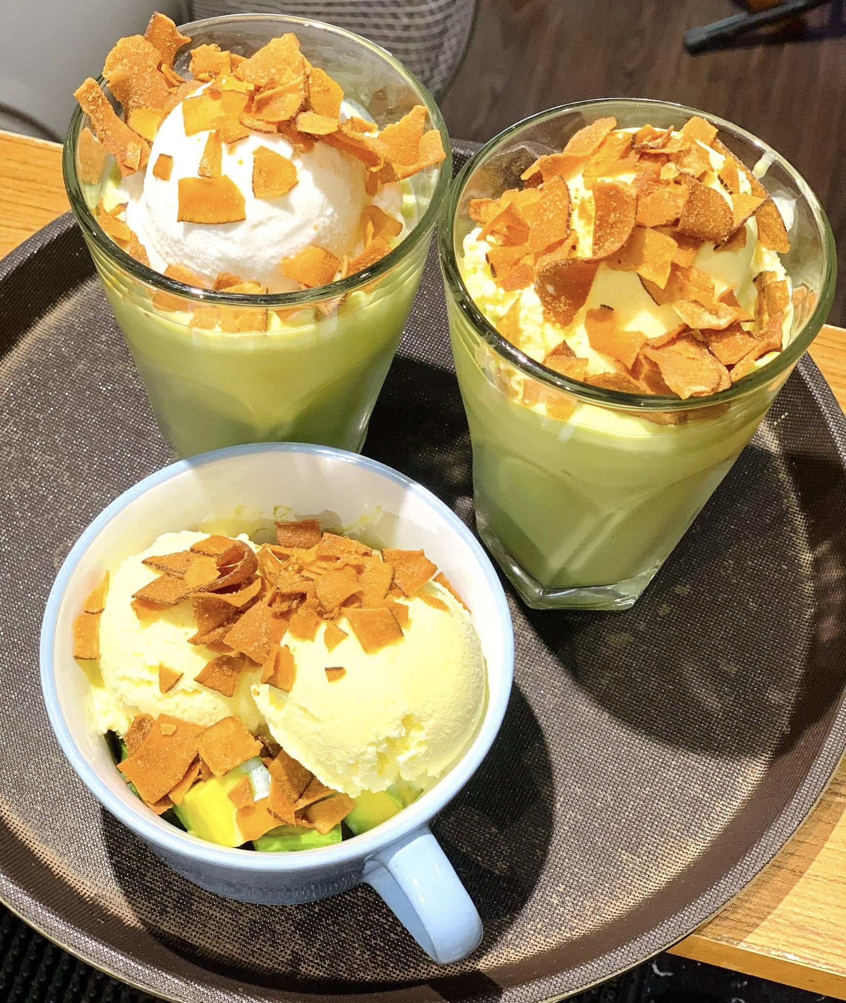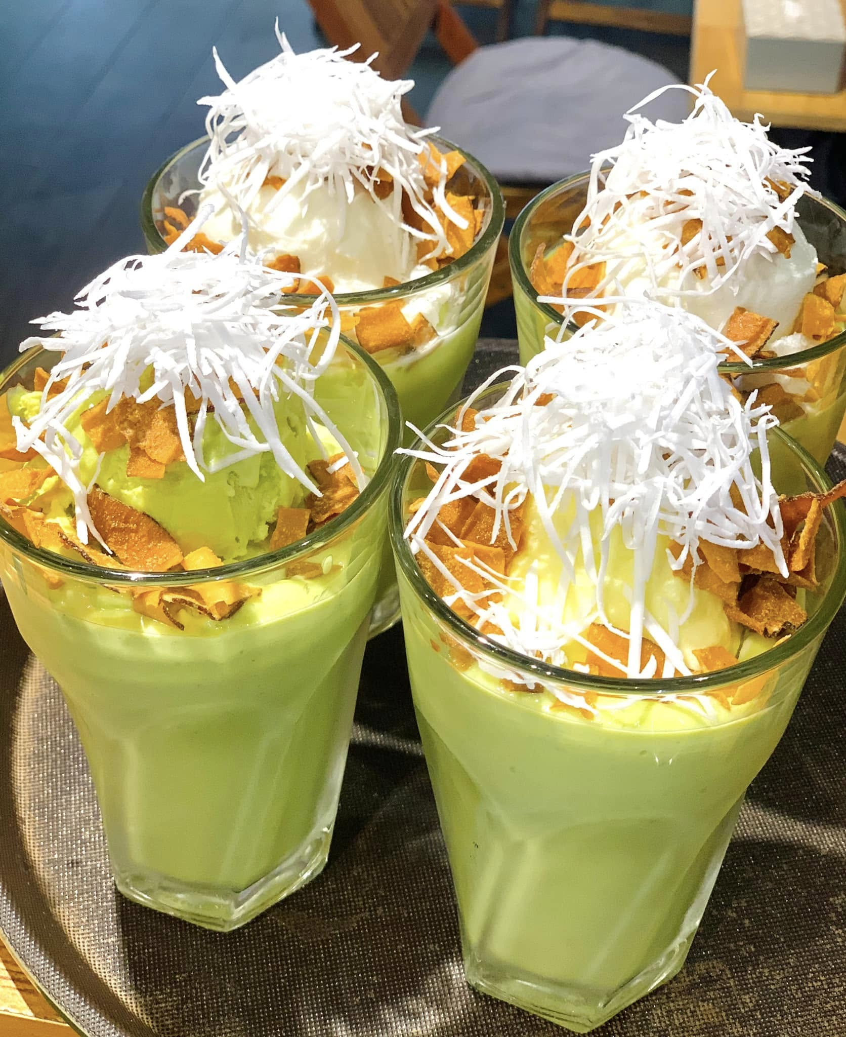 Các nguyên liệu đều được làm tươi mới hàng ngày, không chất bảo quản. Ăn kèm kem bơ là dừa non, hạt điều rang, sầu riêng hay matcha. Đặc biệt, quán có không gian rất đẹp mắt, với tông màu xanh non, tươi mát làm chủ đạo, phù hợp với các buổi hẹn hò, gặp gỡ bạn bè.