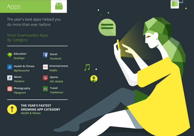 Google cũng cho biết các ứng dụng về sức khỏe và thể dục thể thao là những ứng dụng phát triển nhanh nhất.