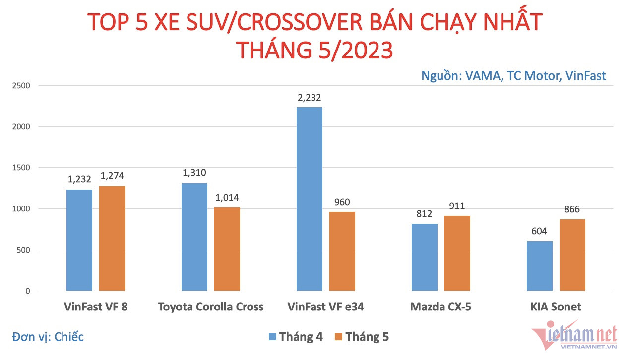 Ở nhóm xe đa dụng (SUV/crossover), hầu hết các mẫu xe đều bị tụt doanh số rõ rệt. VinFast VF e34 sau 1 tháng bùng nổ với hơn 2.200 chiếc bán ra đã chỉ đạt chưa tới 1.000 chiếc trong tháng 5. Tuy vậy "người anh em" VF 8 lại giữ vững phong độ, bán ra 1.274 chiếc vươn lên soán ngôi của VF e34.