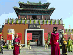 Sau khi tham quan Phủ Khai Phong, du khách còn có thể sang thành lầu để tham gia hoạt cảnh tái diễn cảnh con gái Vương thừa tướng ném tú cầu kén chồng.