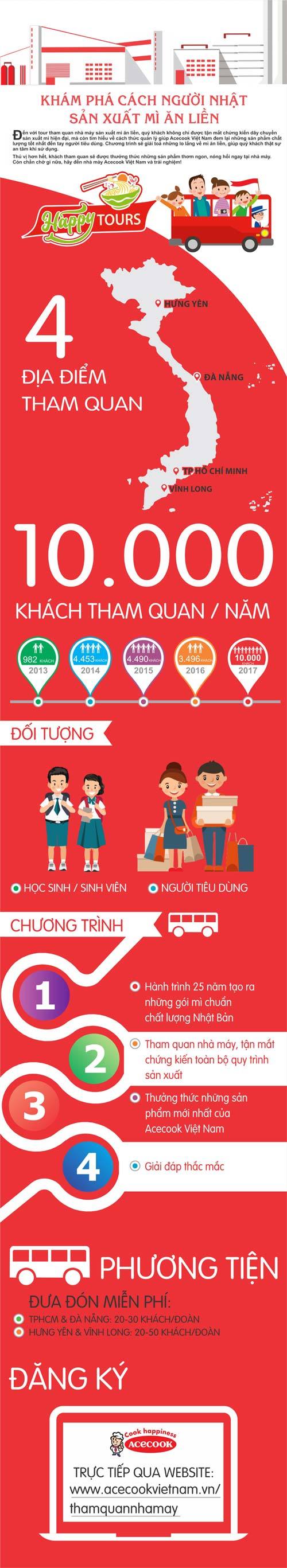 Đến với tour tham quan nhà máy sản xuất mì ăn liền của Acecook Việt Nam, người tham quan tận mắt chứng kiến hành trình cho ra đời những sản phẩm mì chất lượng trên dây chuyền sản xuất hiện đại theo công nghệ Nhật Bản.
