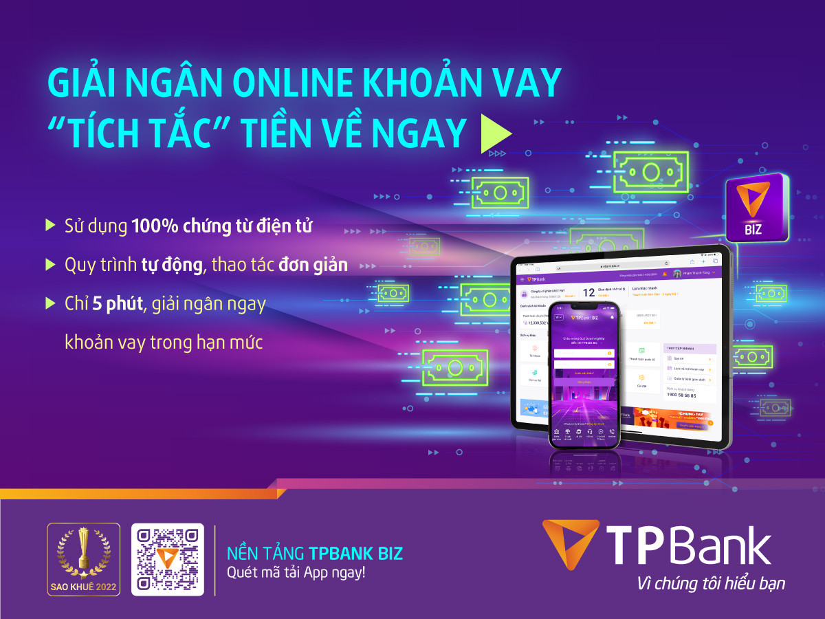 Không cần chuẩn bị hồ sơ bản cứng, không cần tới ngân hàng, giờ đây khách hàng doanh nghiệp muốn vay vốn, chỉ cần thực hiện 3 thao tác đơn giản ngay trên ứng dụng TPBank Biz là có thể hoàn tất hồ sơ giải ngân. Đây là tính năng mới lạ, độc đáo và đột phá từ TPBank, góp phần tối ưu hóa chi phí, tiết kiệm thời gian và nâng cao trải nghiệm số hóa của khách hàng doanh nghiệp.