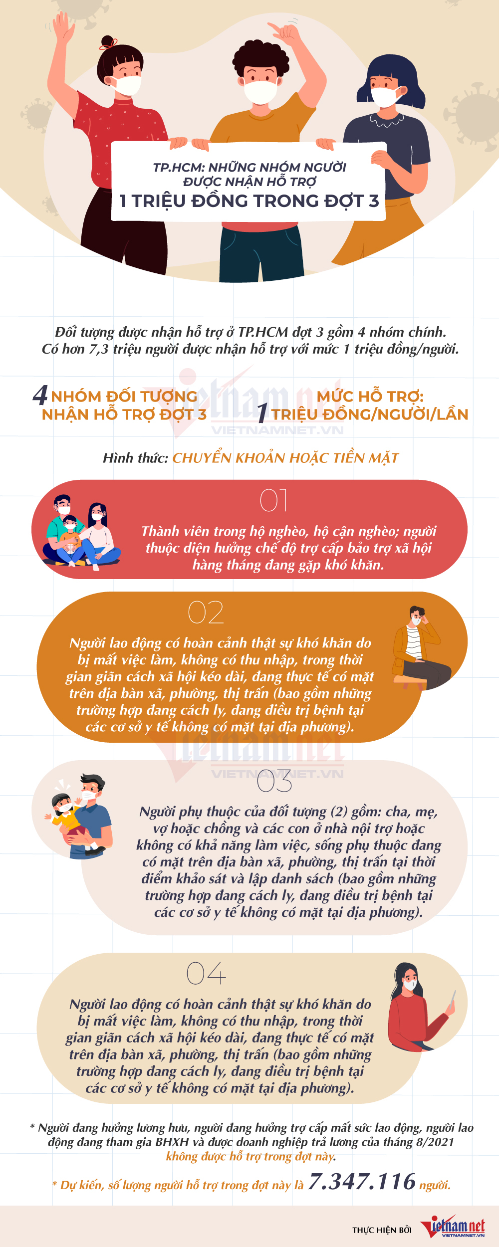 Đối tượng được nhận hỗ trợ ở TP.HCM đợt 3 gồm 4 nhóm chính. Có hơn 7,3 triệu người được nhận hỗ trợ với mức 1 triệu đồng/người.