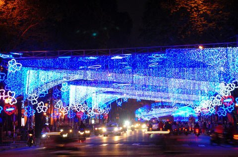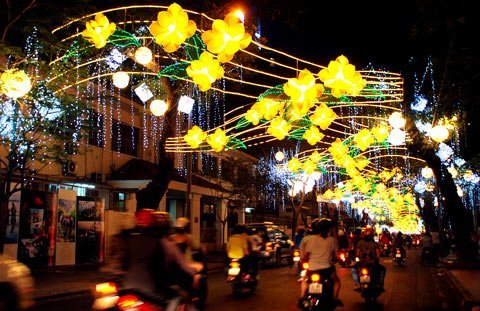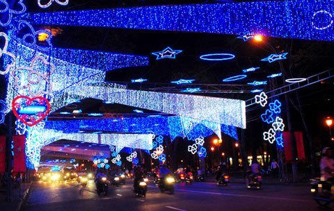 Đường Đồng Khởi được trang trí với các khuôn nhạc bằng đèn led mang những nốt nhạc hoa mai, hoa đào. Đường Lê Lợi sống động với sóng hoa mai thành hình rồng bay. Đường Nguyễn Huệ có bốn cổng vòm xanh in hình các châu lục. Đường Lê Duẩn với các khung đèn led kết thành dải thiên hà.
